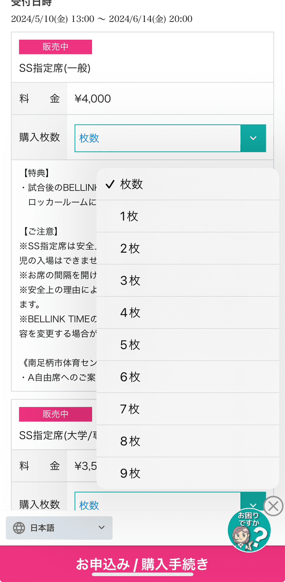 座席図を参考にしながら、購入する座席/枚数を選んでいこう!