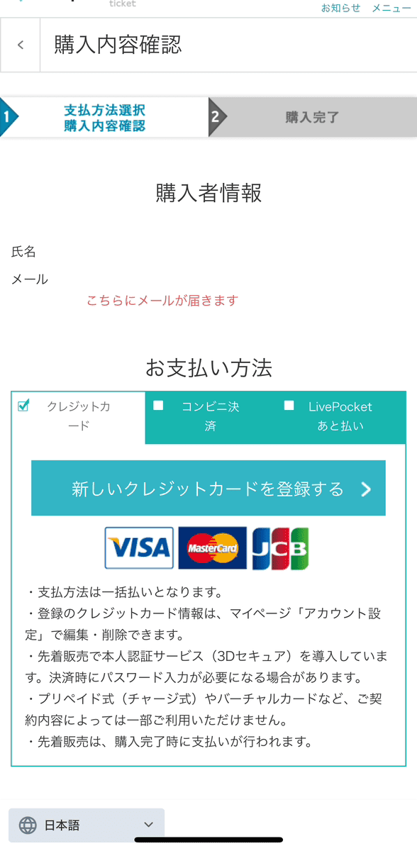クレジットカード決済(VISA・MasterCard・JCB)、コンビニ決済(ローソン・ファミリーマート・ミニストップ・デイリーヤマザキ・セイコーマート)、livepocketあと払いから支払いを完了させよう!