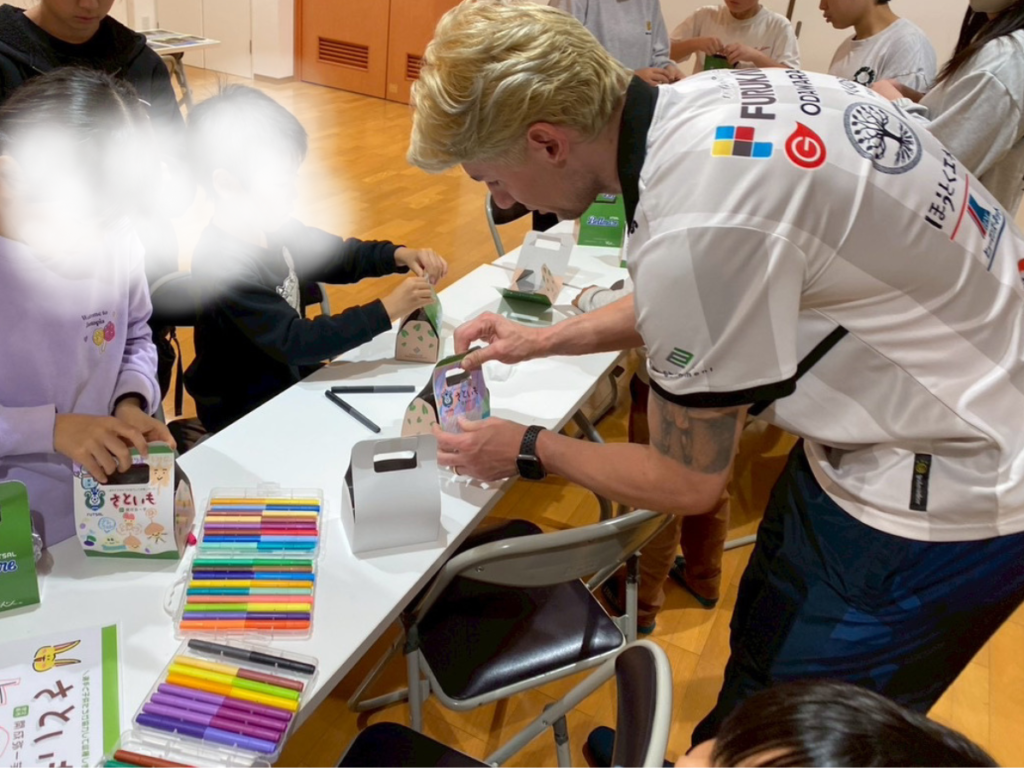 午後からは、鎌野憲佑選手に代わり、籔内涼也選手と一緒にゆりかご園で小田原紙器さんより今回のイベント用に特別に制作された専用パッケージのデザインを行いました。