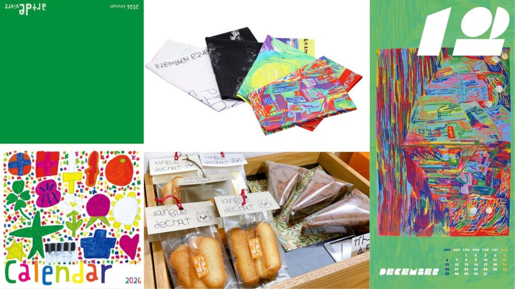 当日は、2026年アール・ド・ヴィーヴルオリジナルカレンダー、ぽち袋、付箋などのステーショナリーやパウンドケーキ、ガトーショコラ、ビスコッティなどの焼き菓子を販売予定です! カレンダーの12月面やハンカチスカーフには、奧津大希さんの描いた湘南ベルマーレフットサルクラブをイメージした作品がデザインされているので要チェックです!ぜひお早めにご来場のうえGETしてください!!