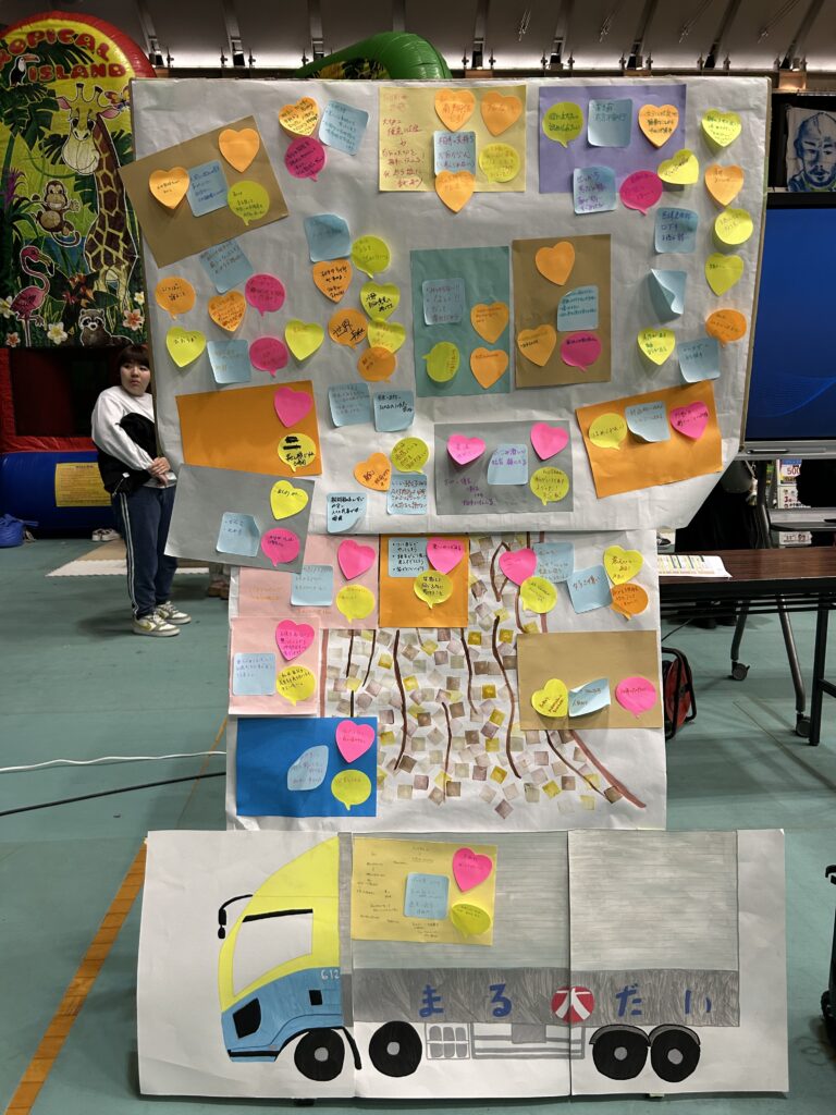 最後は、一人ひとりが自分自身「私は○○です。」と大切にされることを宣言し、このワークを通して自身の想いを書いた紙を木に貼っていきました。この木はまるだい運輸倉庫のトラックの上に立っており、この皆の想いをまるだい運輸倉庫のトラックが地域の未来へ運んでくれます。
