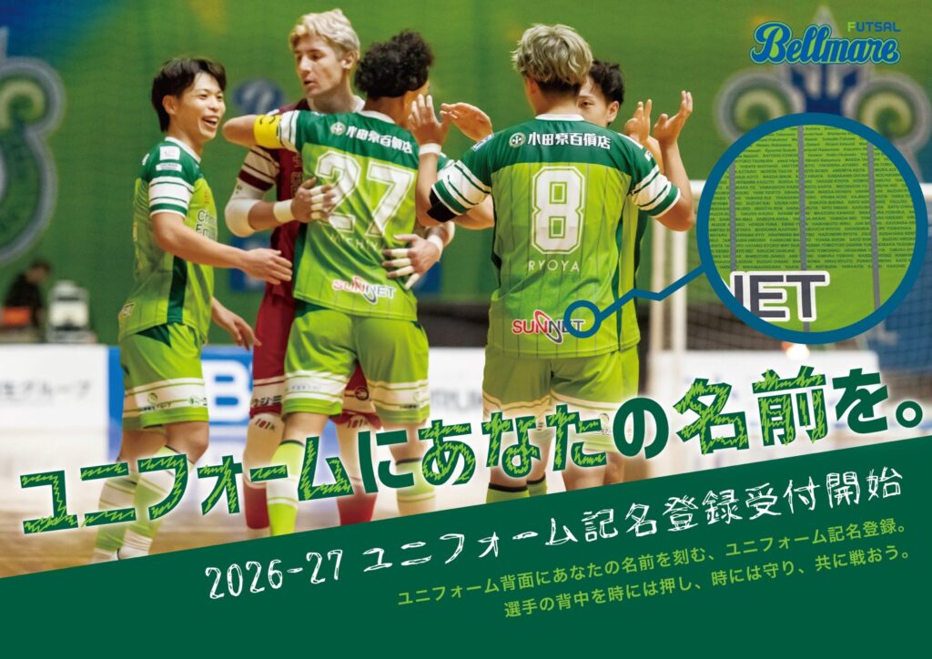 湘南ベルマーレフットサルクラブでは、「サポーターの皆さまと共に戦う」との思いを込め、希望者の方々の名前を使ったデザインをユニフォームに施しています。来る2026−27シーズンでも、この記名デザインユニフォームを作成し、皆さまと共に戦わせていただくこととなりましたので、募集を開始いたします。