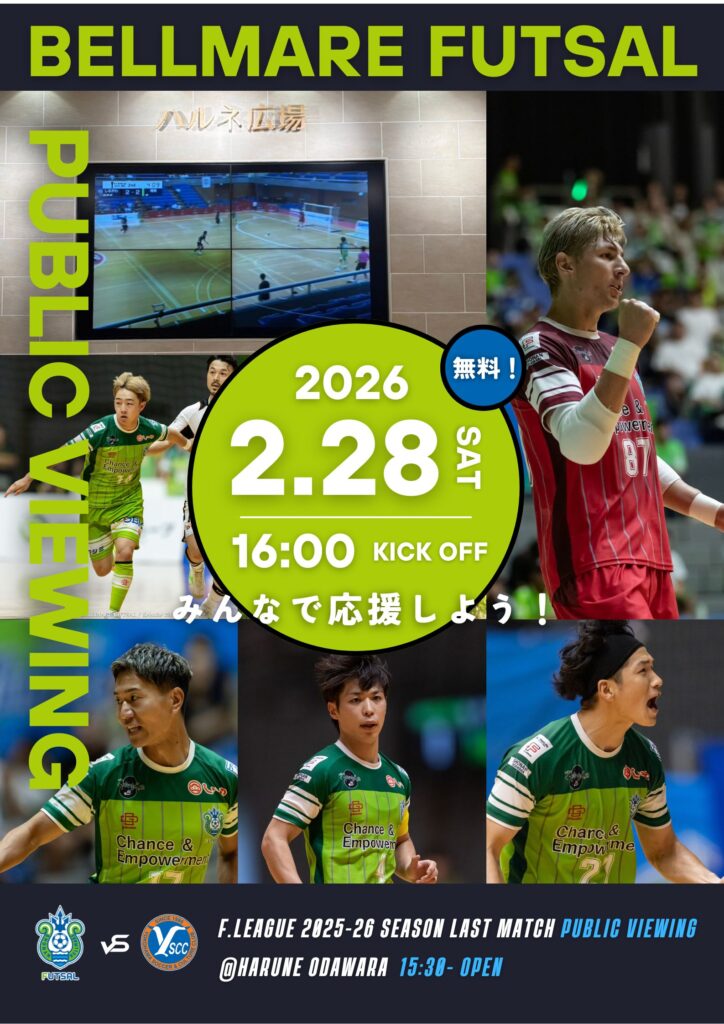 湘南ベルマーレフットサルクラブでは、小田原市の協力により、2月28日(土)に開催される、メットライフ生命Fリーグ第27節Y.S.C.C.横浜戦を、HaRuNe小田原内ハルネ広場にて観戦するイベント、ベルマーレパブリックビューイングを開催することが決定いたしましたのでお知らせいたします。
